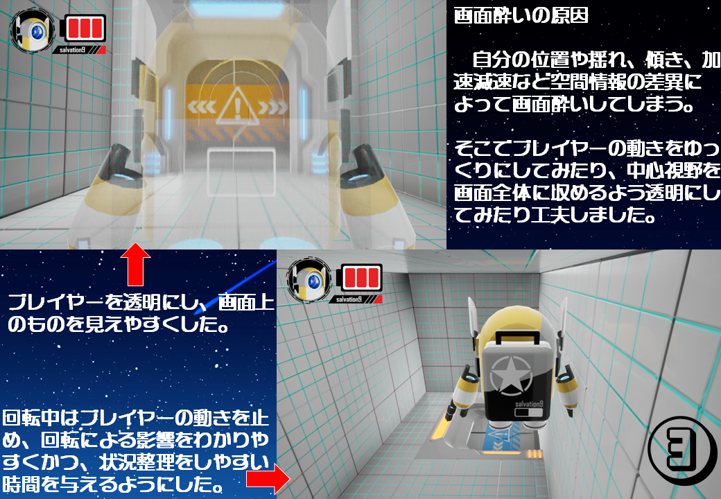 回転するや動きが大きいゲームでは3D酔いが多いと考え、3D酔いの原因を調べ仕様を実装しました。プレイヤーの動くスピードや操作感度、回転の際のカメラをできるだけ酔いにくくなるよう設定しました。