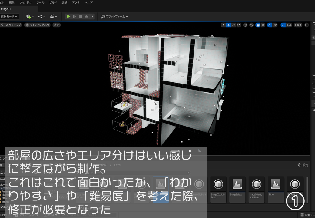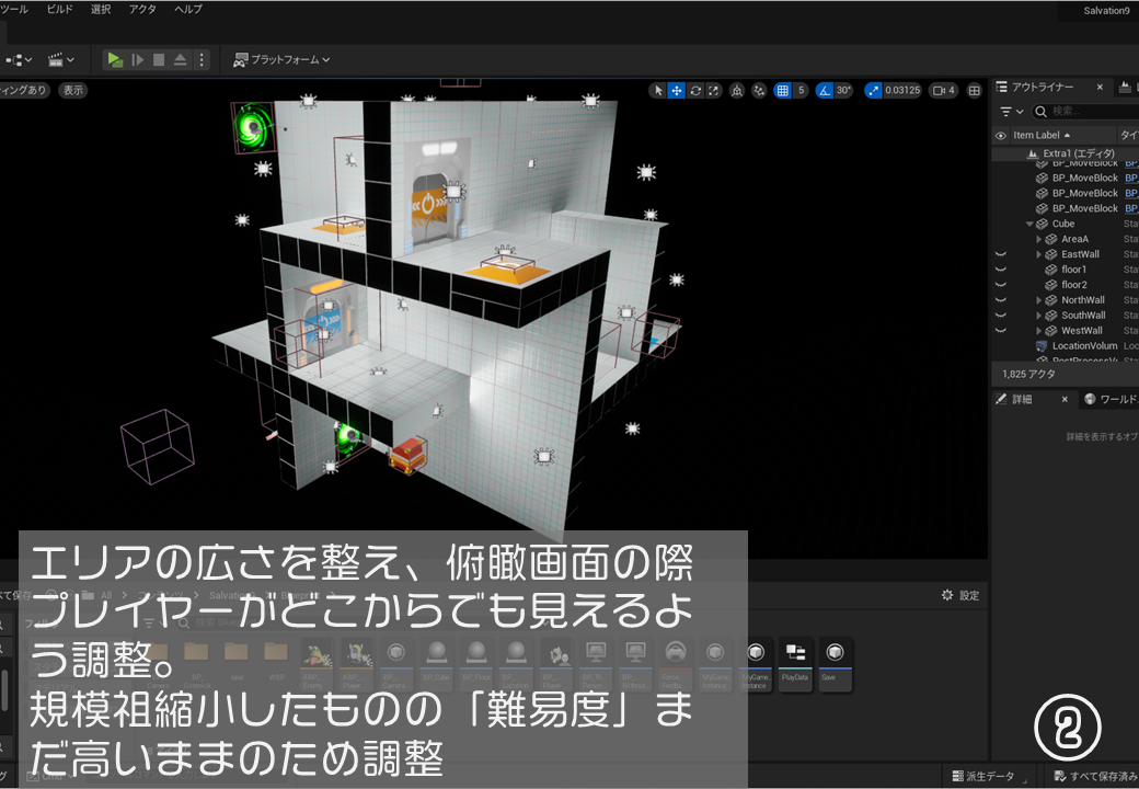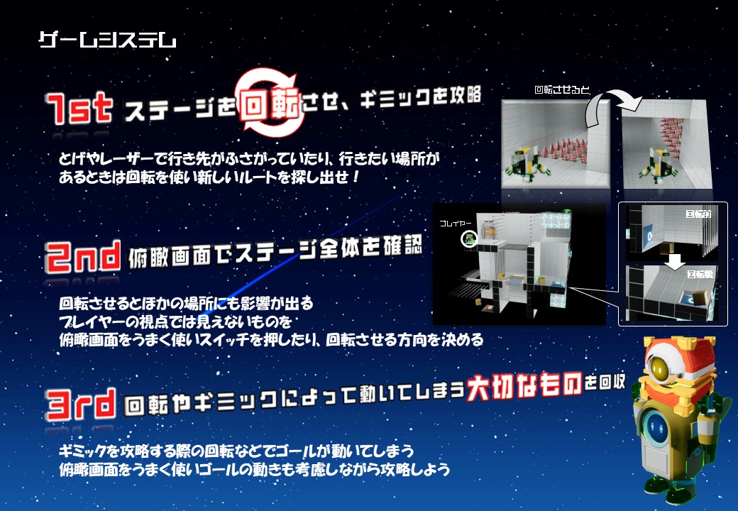 エリアごとでステージを分けすっきりとさせ、俯瞰画面とサードパーソンを切り替えて楽しめるゲームにしました。
