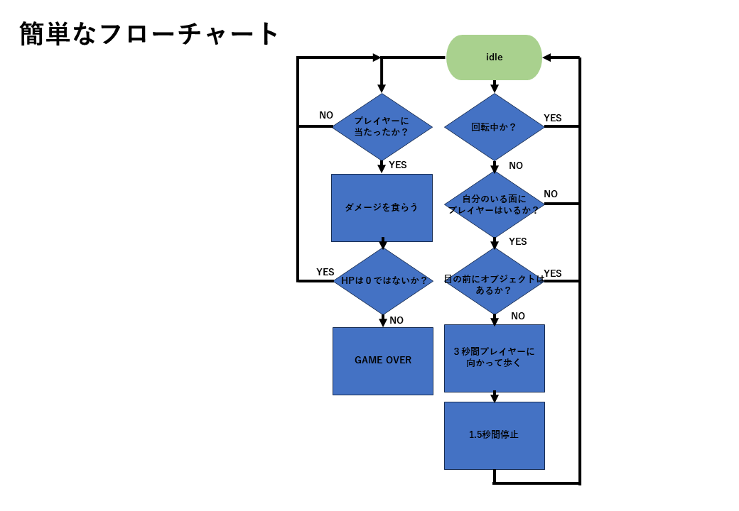 そのため、敵AIのアルゴリズムを考え、エネミーコントローラーを使用し作成しました。